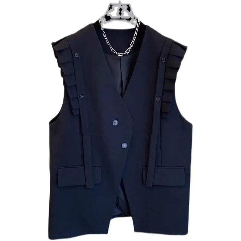 سترة نسائية جديدة لربيع وخريف 2024، معطف بفتحة على شكل حرف V، بدون أكمام، بلوزات كبيرة الحجم، مرقعة، كشكشة، صدرية كاجوال، دبابات كورية عصرية