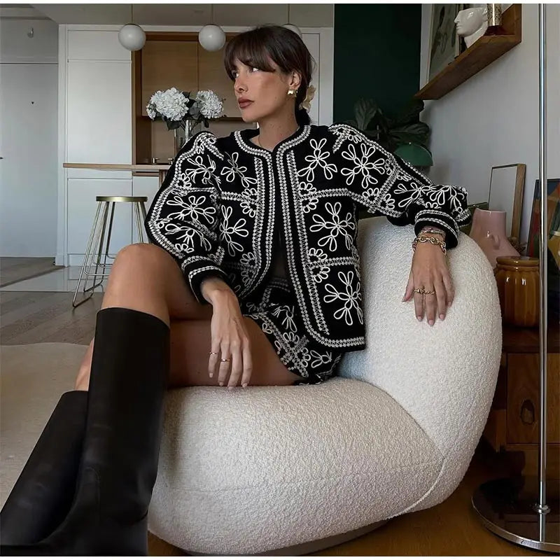 معاطف نسائية قصيرة من القطن برقبة دائرية وطبعة عتيقة وأكمام واسعة من الفانوس، سترات قصيرة أنيقة لخريف وشتاء، ملابس الشارع الأنيقة